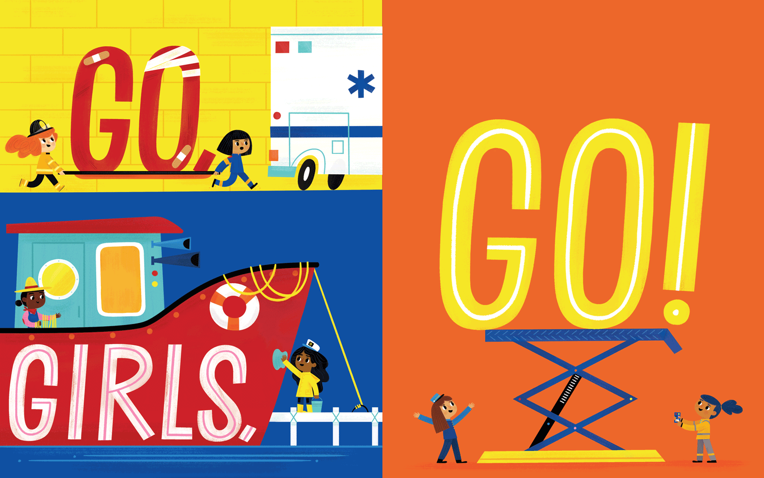 “Girls drive, push, and propel through the book, with a dynamic layout dividing the pages into horizontal streaks of movement, followed by pages giving shout-outs in huge, bright letters to the noise each girl makes…and culminating with a chorus of “GO, GIRLS, GO!” Active verbs abound, the rhyming text is propulsive, and Black’s illustrations are blasting with color and movement….” (Booklist October 2019)