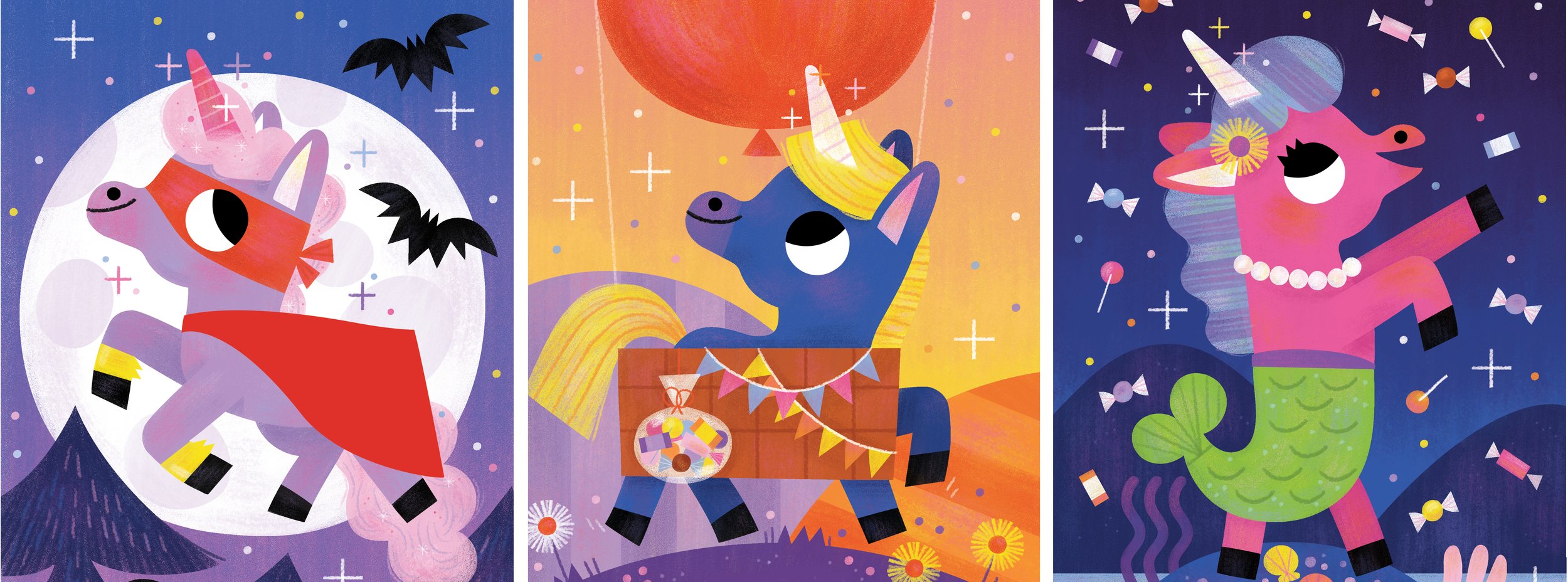 The unique tall format and textured areas of the book presented an exciting creative challenge. I crafted enchanting scenes for each sweet unicorn, filling the space with whimsical Halloween details—candy bags, jack-o-lanterns, and glowing moons. Every page bursts with vibrant colors with backgrounds set in the magical glow of twilight.