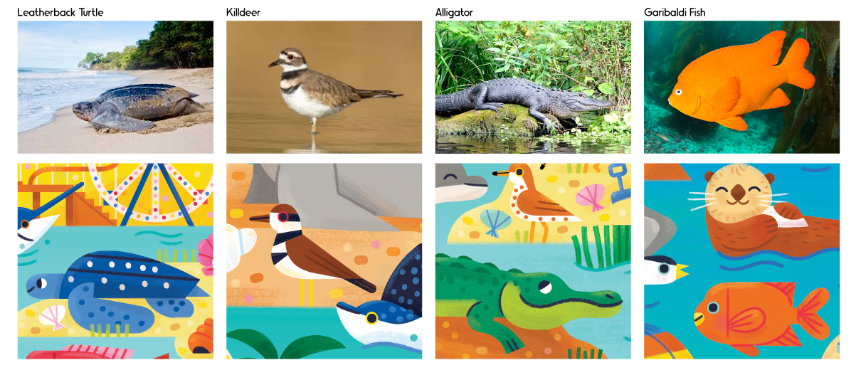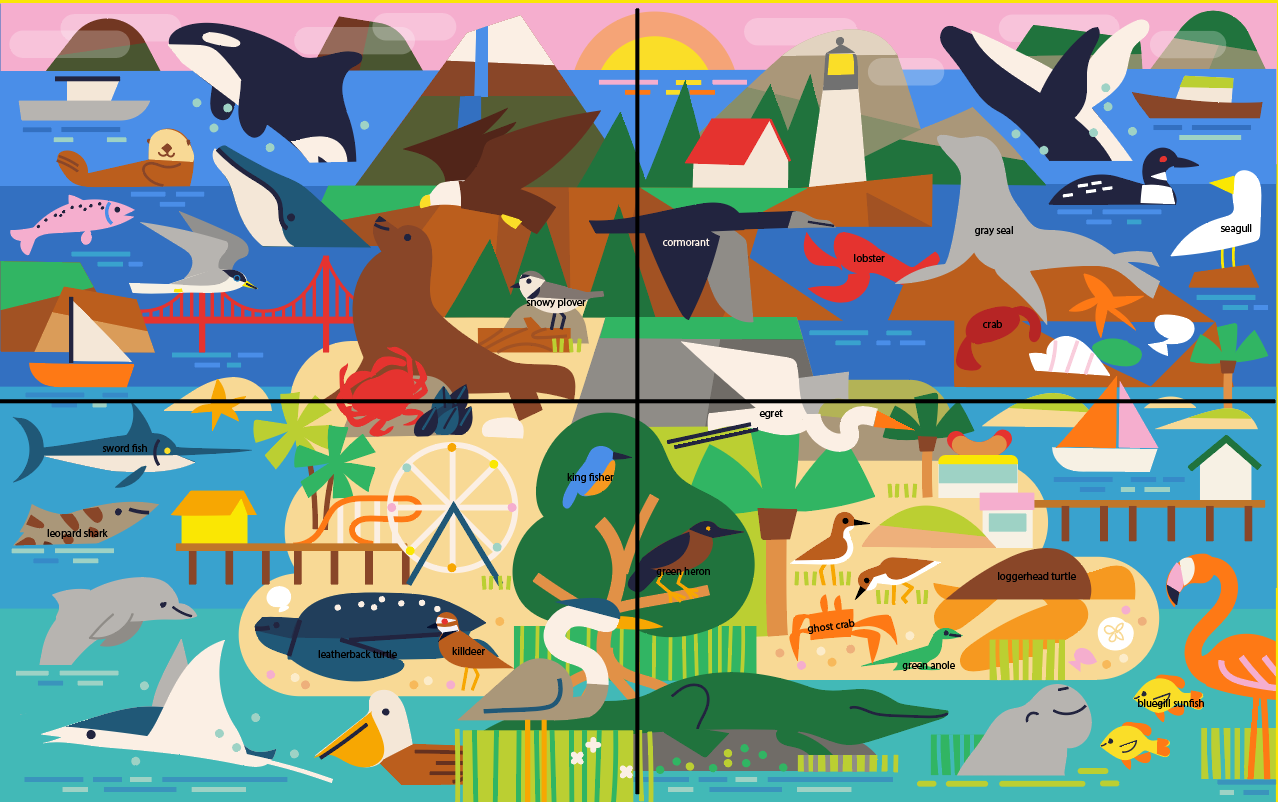 At its core, this project was a celebration of coastal wildlife, and that spirit shows up in the details throughout the illustration. While not stated in the brief, I wanted to make sure the wildlife was accurate to each region. Every animal, fish, and bird in the puzzle reflects species that truly live along those coasts. From a flamingo in the southeastern portion of the puzzle (Florida region) to an orca in the northwest section, the artwork reflects each habitat accurately. This puzzle is designed to reward careful looking and repeated play. The search-and-find border adds an interactive layer, blending the satisfaction of a traditional jigsaw puzzle with the fun of spotting hidden objects.