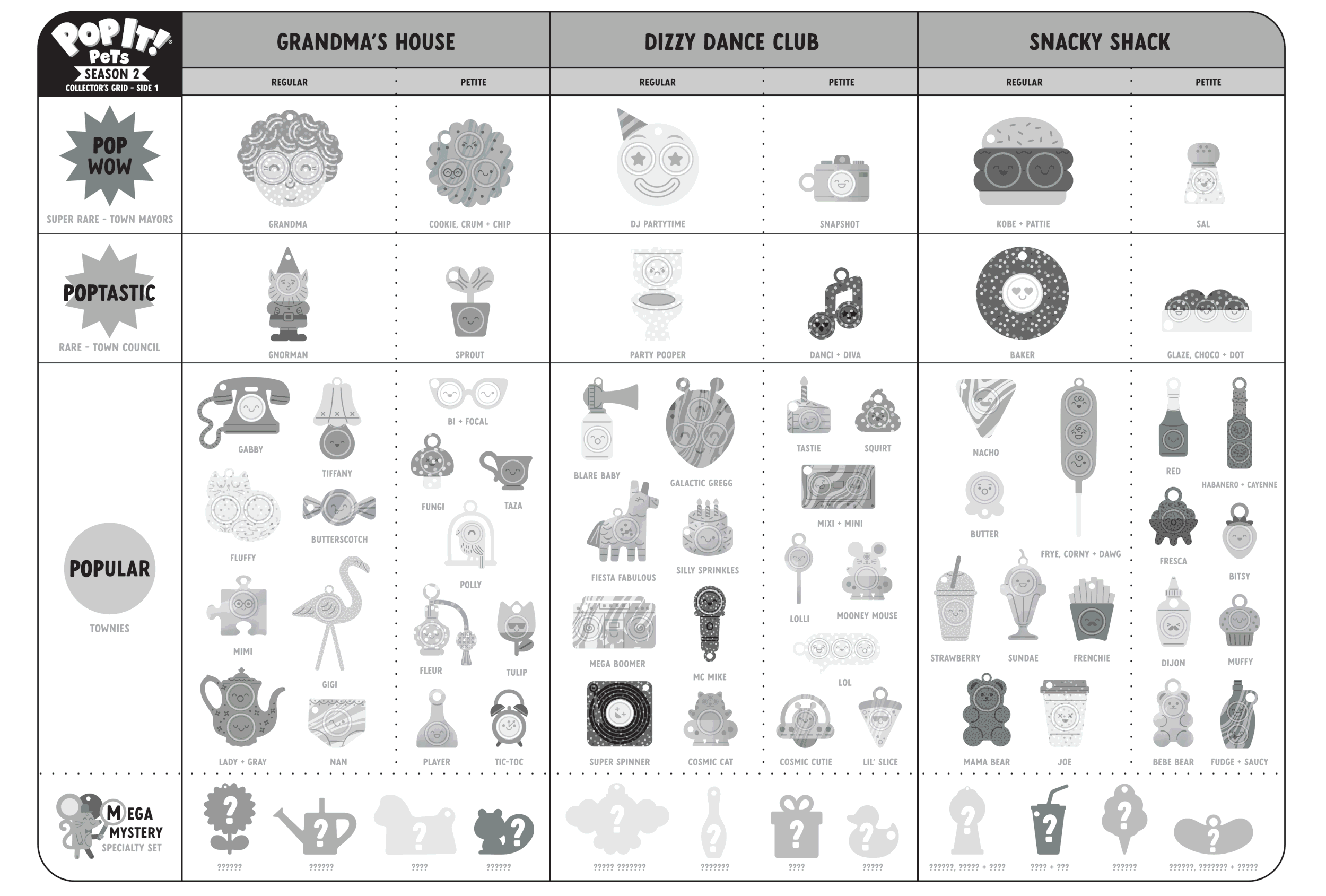 We carried the structure of the collector’s grid from Season 1 into Season 2. Each mystery bag includes a black and white grid that is filled in with colorful stickers as pets are collected. The Season 2 grid had regular size pets, petites and…the Mega Mystery Set!