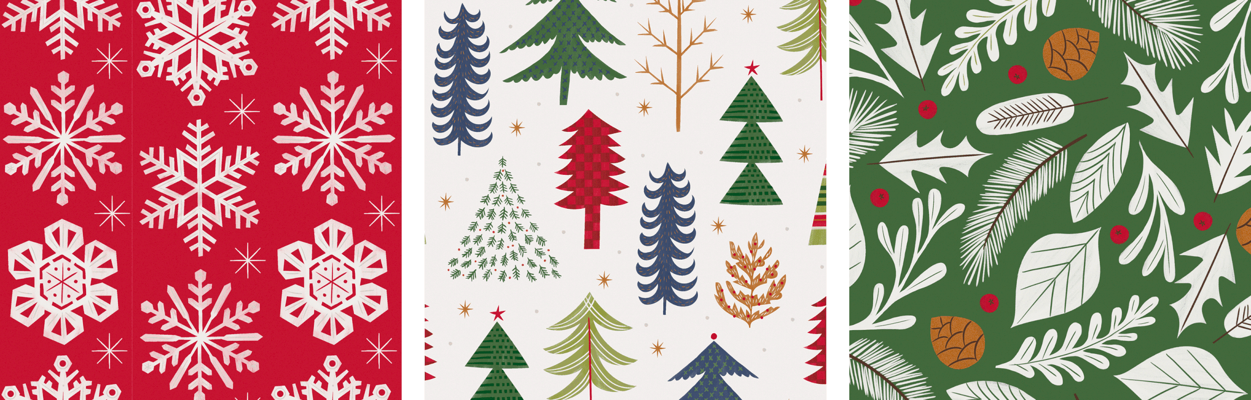 The core patterns for this collection featured natural elements like snowflakes, trees and winter botanicals. I made sure the style was classic but still fresh with a modern touch. The secondary patterns included an array of stripes and plaids, plus mark-making mini prints.