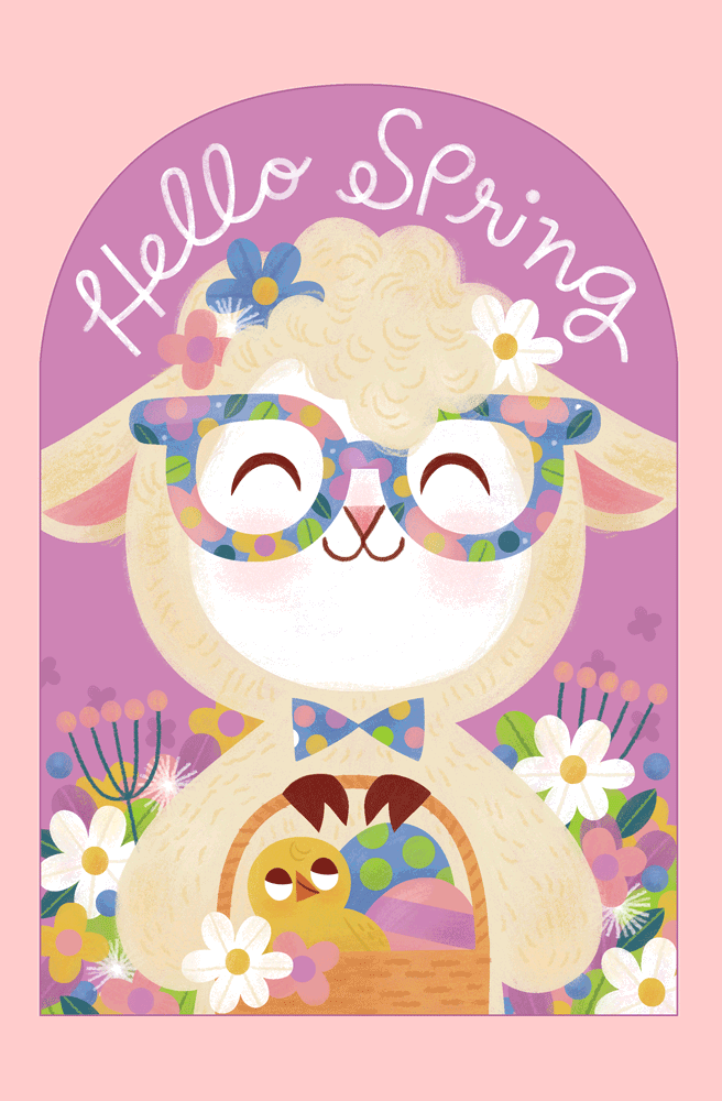 The girl-centered cards featured charming spring animals and bouncy, uplifting messages. I used a quirky palette that played off Stop The Clock's designs with hits of ocher, turquoise and hot pink that made the art pop in stores!